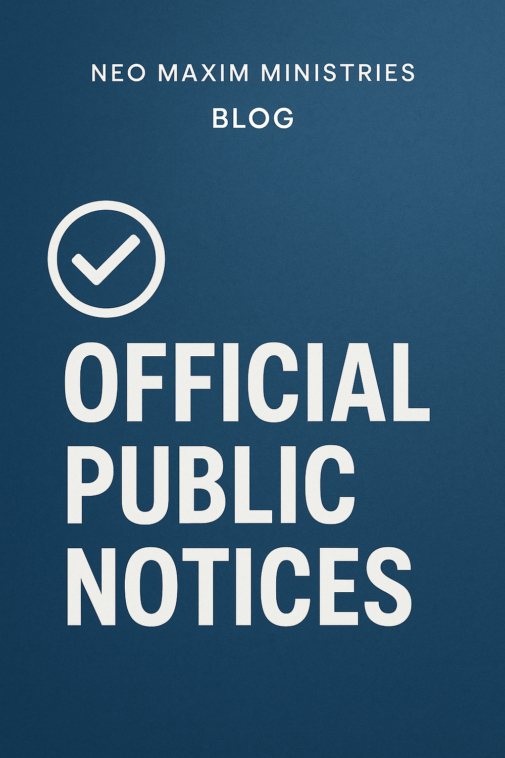 This page serves as the official public notice board for Neo Maxim Ministries, a private ecclesiastical trust operating under the protections of Common Law, the First Amendment, and the private domain of ministry and conscience.